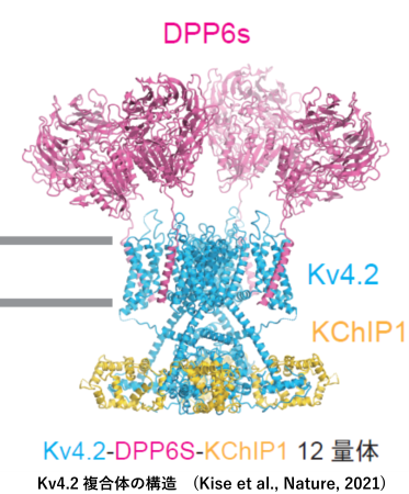 ・電位依存性カリウムチャネルKv4.2超分子複合体のクライオ電顕構造を決定し,サブユニットによるアクションポテンシャルのモデュレーション機構を解明した(Kise et al., Nature, 2021)。