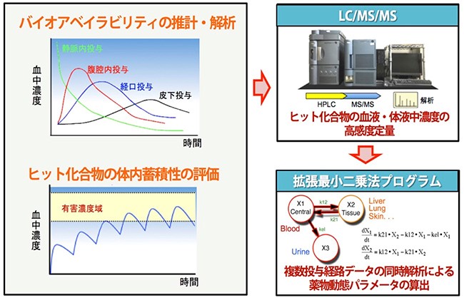 生体試料中におけるヒット化合物の高感度検出法を構築し、疾患モデルの対象となるマウス・ラットを用いてヒット化合物の体内動態解析を行う。得られたデータから吸収・分布・代謝・排泄に関する情報・パラメータを算出し、至適投与量と至適投与法を提案する。